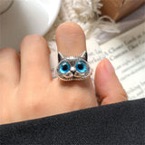 Materials: Silver-tone alloy; domed blue resin/glass eyes; open, adjustable band.